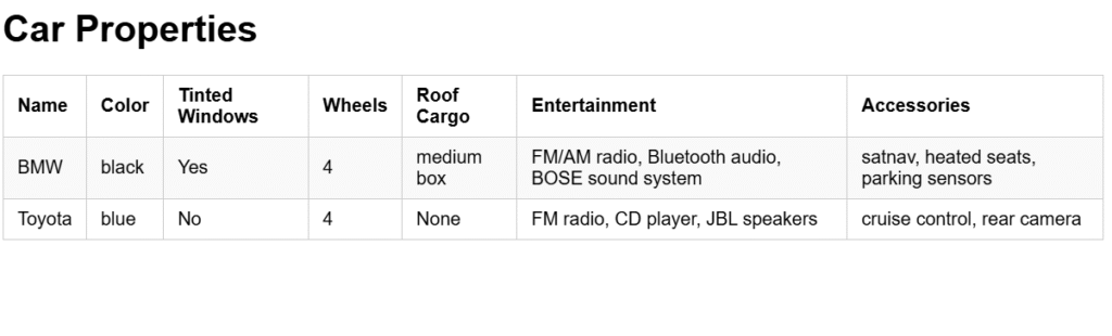 Accessories: ["satnav", "heated seats", "parking sensors"],