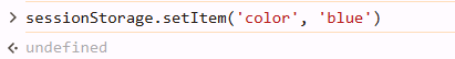 4.Tee uus käsk sessionStorage.setItem(‘color’, ’blue’). Selle käsuga lisati Session Storage’isse uued andmed.